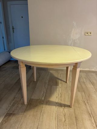 Mesa redonda extensible, ideal para tu comedor o cocina. Su diseño se adapta a diferentes espacios. - Acabado en tonos beige y amarillo. - Fabricada en madera. -Abierta mide 120x150 -Tiene marcas del uso -Recomendable pintarla