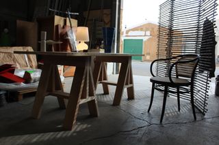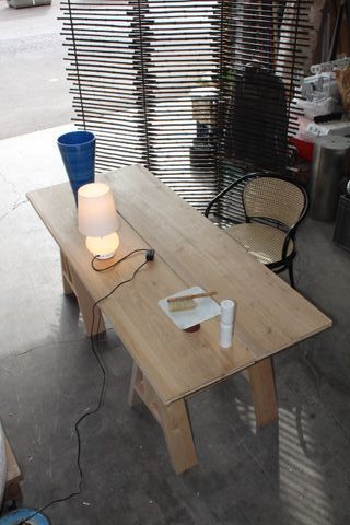 Mesa de diseño moderno, ideal tanto para comedor como para terraza. - Tablero de madera. - Estructura de metal. - Tonos beige y marrón. Las patas son todo un bloque, hace falta una furgoneta para cargarla. Si quereis opción de transporte preguntar precio