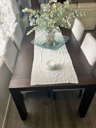 Mesa de comedor extensible de madera en buen estado. Tiene un sistema muy práctico: se abre como un libro y luego se desplaza el tablero para que quede centrado sobre las patas. Es una mesa sólida y estable. Cerrada es ideal para 2-4 personas y abierta caben 6 sin problema. Tiene alguna marca leve de uso normal (ver foto), pero está bien cuidada y funciona perfectamente. Medidas Cerrada: 90 × 90 cm Abierta: 180 × 90 cm Altura: 74 cm - Se vende por cambio de mobiliario. - Preferentemente recogida en persona