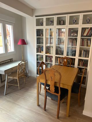 Mesa de madera blanca, plegable: para 4 personas normalmente y se despliega para 6. Incluye 4 sillas a juego. Uso muy ligero, en buenas condiciones. Solo un retoquito menor de pintura en la mesa (normal por madera pintada), no afecta su uso ni estética. Ideal para apartamentos o casas que necesiten espacio flexible.