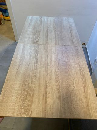 Mesa de madera con diseño plegable, ideal para optimizar el espacio. - Acabado en tono madera natural. - Mecanismo de apertura tipo libro. Con muy poco uso y enmuy bien cuidada . A recoger en Canillejas.