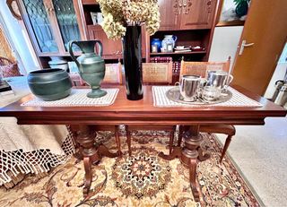Elegante mesa de comedor extensible de estilo vintage. Su diseño clásico aportará un toque de distinción a tu hogar. Se recoje a 36km de madrid pasando navalcarnero - Acabado en madera oscura. - Patas curvas con un diseño cuidado. - Mecanismo extensible para adaptar su tamaño. Medidas cerradas 1,20 ancho x1,00 de hondo x 80 de alto Havierta 218