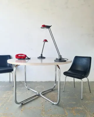 I N S T A G R A M para ver más mobiliario: @ lasperlasdelaabuela **HACEMOS ENVIOS** Entrega GRATUITA en Barcelona ciudad, para otras localidades consúltanos. Mesa redonda estilo Bauhaus con el sobre de formica en color blanco y estructura tubular cromada con reguladores de altura. Diámetro 120cm Altura 74cm diseño design chairs desk oficina icono mila breuer cesca thonet corbusier eames thonet knoll vitra colombo magistretti panton santacole metalarte rohe vitra despacho cantilever escritorio comedor mesa table bauhaus mid century space age white