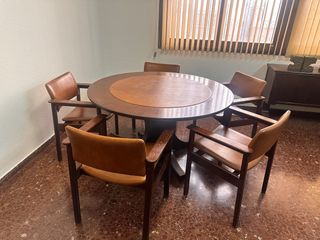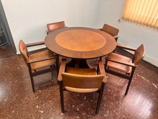 Conjunto de mesa de salón comedor vintage más 6 sillas, comprada en Rotterdam (Países Bajos) para 4 comensales y extensible hasta 6. Ocupa poco espacio al ser circular. Para recoger en Badajoz centro. No se venden por separado.