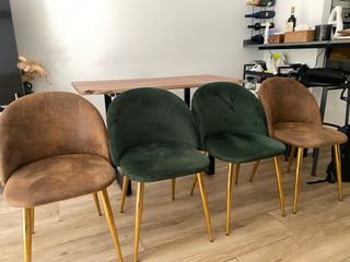 NO SE HACEN ENVÍOS Conjunto de mesa de comedor con diseño de madera maciza y cuatro sillas. - Mesa con borde natural, 118x56x77 cm - Patas metálicas. - Sillas tapizada en Polipiel Kana - Color Café Vintage, con patas Doradas - Sillas de comedor en Terciopelo Kana - Color Velvet, verde Jungla, con patas Doradas