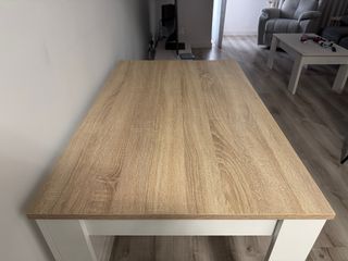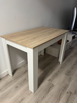 Mesa extensible de madera en tonos beige y blanco. Su diseño es sencillo y funcional, ideal para cualquier comedor. - Patas robustas para mayor estabilidad. - Superficie lisa y fácil de limpiar.