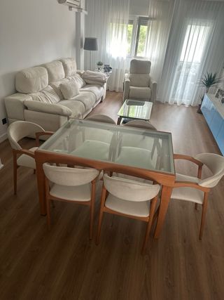 Conjunto de mobiliario para comedor y salón. - Mesa de comedor con sobre de cristal y estructura de madera. - Mesa extensible 1,20m en estado normal, 2,40m abierta - Seis sillas tapizadas en color blanco roto. - Mesa auxiliar para salón de cristal con dos altura y doble fondo. - No tienen ningún arañazo ni nada roto, siempre bien cuidadas vendo por cambio de muebles