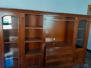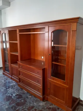 Mueble de salón de madera maciza nada de aglomerado con varios compartimentos y cajones. - Estructura de madera. - Puertas de cristal en los laterales. - Cajonera central con tres cajones. - Compartimentos abiertos y cerrados. Mesa camilla. Mesa de comedor ovalada de madera maciza con 4 sillas.