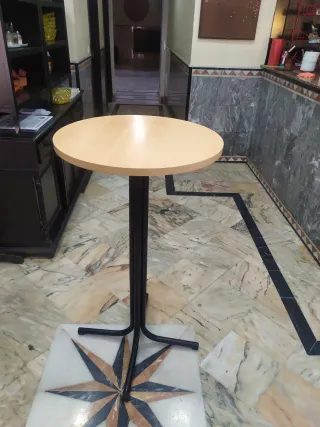 Mesa de pie con tablero redondo. - Tablero de madera. - Base y pie de metal.