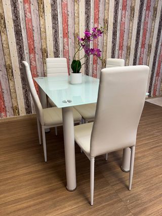 Mesa blanca con tapa de cristal y set de 4 sillas a juego.Excelente estado Conjunto de mesa blanca con cubierta de cristal templado y 4 sillas a juego, perfecto para comedor o cocina. Diseño moderno y elegante que aporta luminosidad y combina fácilmente con distintos estilos de decoració