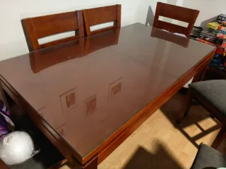 Elegante mesa de madera hecha a mano por carpintero y cristal a medida. - Medidas: 180x80 (incluido en fotos) - 6 sillas a juego La vendo por falta de espacio