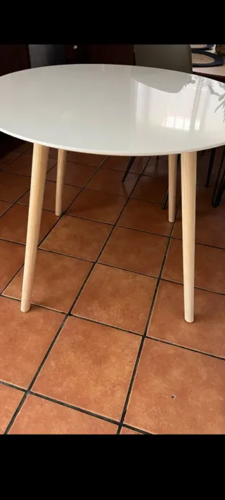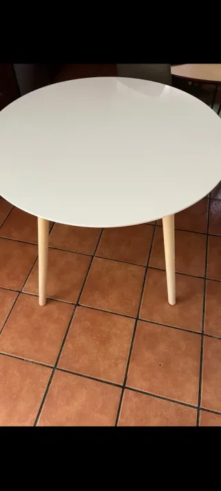 Mesa redonda de diseño moderno con patas de madera. - Tablero liso y fácil de limpiar. - Patas cónicas de madera clara. Recogida en Alcalá de Henares.