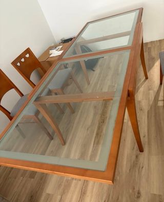 Mesa extensible. Tapa de cristal. 4 patas en color wengue.Estado bueno. URGE VENDER. Medida extension 180×90. Con reparador se tapa los desperfectos la mesa esta desmontada y lista para recoger