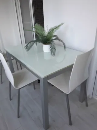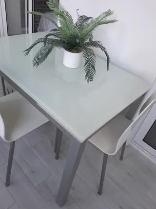 Mesa de comedor con superficie de cristal y estructura de metal. - Diseño moderno y elegante. - Patas metálicas resistentes. Cuatro sillas blancas, está todo como nuevo solo usado en verano . Medidas Mesa cerrada 110 X 70 . Alto 73. Mesa abierta 170 X 70 X 73 de alto. Cuatro sillas blancas.