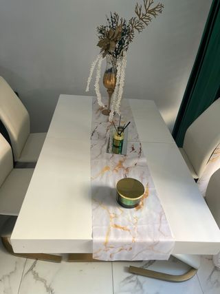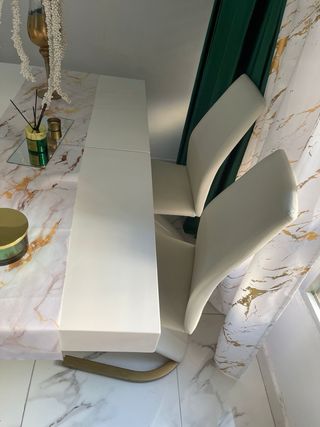 Mesa de comedor extensible en color blanco, con un diseño moderno y elegante. Perfecta para adaptar a diferentes espacios. Las medidas son: 1,40 cm x 90 cm x 78 cm de alto. Se hace extensible, añadiendo una tabla en medio y quedaría una mesa de 1,90 cm de largo. Incluye cristal (para usarlo cuando la mesa no está extendida). Está muy nueva, con muy poco uso. Regalo también 4 sillas de color negro, que están en buenas condiciones, pero con más usos).