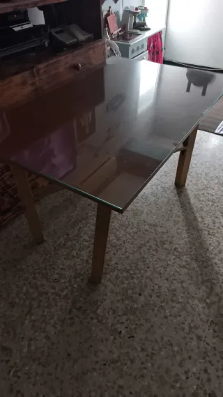 Mesa de madera con tapa de cristal