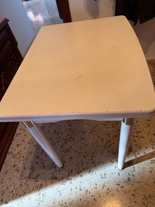 Conjunto de mesa extensible de 70 x80 estando cerrada algo más grande abierta. 4 sillas Se pueden pintar si se desea cambiar el color ya que no son lacadas, o si se desea mejorar el color blanco.