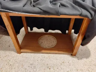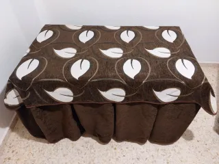 Mesa redonda de 1 metro de diámetro,con falda camilla la cual tiene una raya que venía con esa tara de fabrica.Si vive en Badajoz capital y no tiene coche se lo podría llevar yo