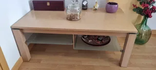 Mesa de salón de madera y cristal. Dos alturas