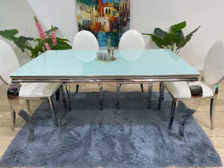Elegante conjunto de comedor que aporta un toque de lujo a tu hogar. La mesa combina un sobre de cristal con una base de metal pulido. - Diseño moderno y sofisticado. - Mesa con sobre de cristal. - Base de mesa en metal plateado. -metodos de fiananciacion y envios a tu domicilio con pagos contrareembolso -hermoso elegante y duradero consulta tu porte de envio con tu codigo postal.