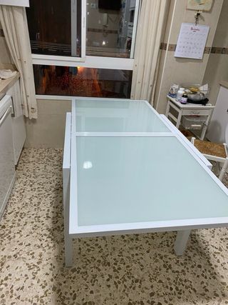 Mesa de cocina con superficie de cristal y estructura de metal - Diseño moderno y elegante. - Ideal para espacios compactos. medidas cerrada: 80x80 altura: 77 medidas abiertas 80x 169 recoger en Cádiz