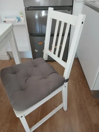 Conjunto de mesa + cuatro sillas de comedor con un diseño clásico y elegante. - Asientos tapizados en tela color beige. - Respaldo con varillas verticales. La mesa es cuadrada y extensible. Está con las patas desmontadas para que sea más fácil el transporte. Tanto la mesa como las sillas están en perfecto estado, sin ningún rasguño. Se encuentran en un trastero en Ripollet. Vendo también la mesa suelta por 25€. Y si interesa más de un artículo de mi perfil, hay descuento. La recogida y el transporte corre a cargo del comprador. Atención!!! Última semana a la venta.