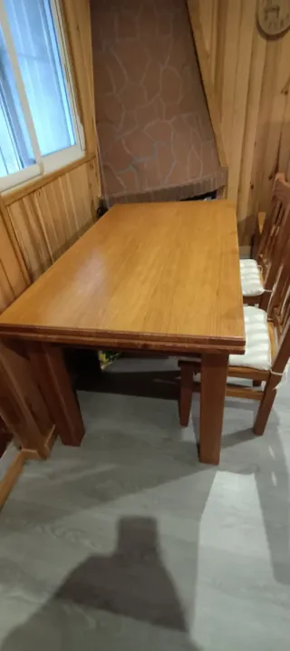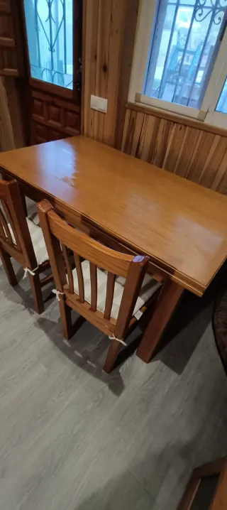 Mesa de comedor de madera maciza, pesada y muy resistente. No es Ikea ni mueble ligero (no prensado). Medidas: • 140 x 80 x 80 cm • Extensible Incluye 4 sillas a juego de madera maciza con cojines. Buen estado general, estructura firme, sin holguras. Ideal para quien busca una mesa sólida que dure muchos años y no pase de moda. Se vende por cambio de mobiliario. Recogida en mano en Aiguamúrcia Tarragona.