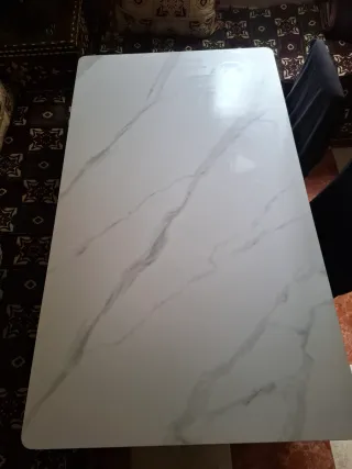 Elegante mesa con un diseño moderno y sofisticado, perfecta para cualquier comedor o sala de estar. - Superficie con veteado de mármol. - Patas resistentes. Disponible solo en Ceuta