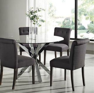 Conjunto de mesa de comedor con diseño moderno y cuatro sillas a juego. - Mesa con superficie de cristal negro. - Sillas tapizadas en color gris. - Estructura de las sillas en metal cromado.