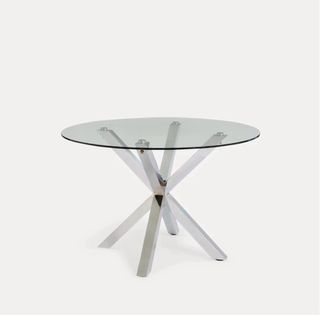 Elegante mesa con superficie de cristal y estructura metálica. - Diseño moderno y versátil. - Patas cromadas en forma de tijera.
