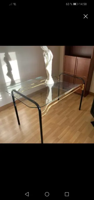 preciosa mesa de comedor, 6 plazas, con marcas de uso(se pueden apreciar en las fotos). corte muy bonito y actual, con cristal translúcido comprada en tienda de muebles está ya desmontada si es cerca de C.Villalba y no dispones de vehículo, puedo transportala por un precio económico.