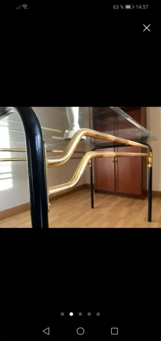 OFERTA!!!!!! Conjunto de mesa de centro con sillas. sillas: - Diseño elegante con detalles dorados. - Patas y estructura de las sillas de metal. mesa: - Tablero de cristal negro en perfecto estado . - Patad y bordes de madera. - La mesa está muy bien cuidada, se abre y se hace más grande, hay dos patas que al mover la mesa se vencen un pelín pero al tirar por ese lado se colocan .