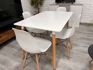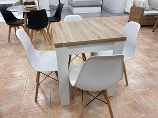 Conjunto de mesa de comedor blanca con cuatro sillas. - Mesa de diseño moderno. - Sillas con patas de madera y asiento de plástico. ✔️Llama al 643*189*083 ✔️Envios y montajes ✔️Pagas al recibir ✔️Garantia de Fabrica ✔️Te llega en su embalaje original