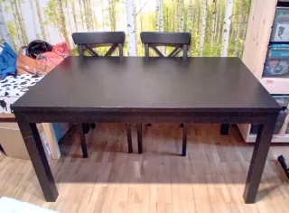 Conjunto de mesa extensible y cuatro sillas. Casi sin uso, y siempre tapada con mantel, prácticamente nueva. Solo venta en persona. - Mesa de comedor con acabado en madera oscura. - Diseño moderno y funcional. - Incluye cuatro sillas a juego. Cerrada mide 1.40cm y abierta 2.20m Sin sillas 120eur y con sillas 175eur.