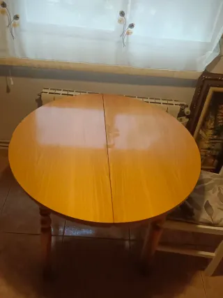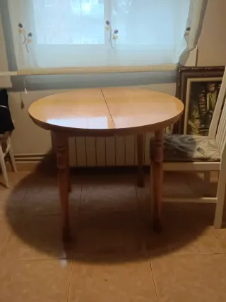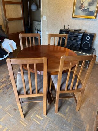 Conjunto de mesa redonda de madera con cuatro sillas. - Mesa de comedor con acabado en madera. - Es redonda de 90cm, es extensible 30 cm, abierta queda en 120cm - Sillas con asiento tapizado en tela (se regalan las sillas y el mantel). A recoger en Madrid (Fuencarral)
