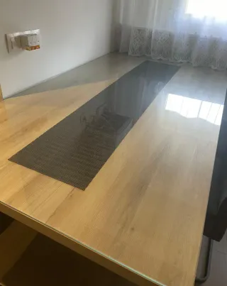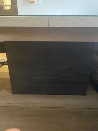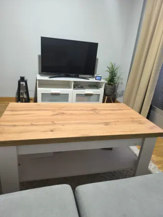 Elegante mesa de salón con un diseño moderno y líneas limpias. Combina a la perfección la calidez de la madera con el toque contemporáneo del cristal. - Acabado en tonos beige y negro. - Superficie de cristal integrada. Tiene una pequeña grieta entre dos cristales, se aprecia en la foto. A recoger en Eurovillas, también envíos. Precio negociable.