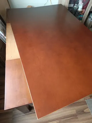 Elegante mesa de comedor de madera maciza en color caoba / cerezo oscuro. Un mueble robusto, de gran calidad y con un diseño clásico de bordes ondulados. Medidas: 160 cm (largo) x 90 cm (ancho). Estado: Buen estado estructural. Presenta marcas normales de uso y el paso del tiempo en la superficie (ver fotos), lo que le da carácter o permite restaurarla fácilmente. Detalle importante: Originalmente era extensible, pero actualmente el mecanismo no funciona, por lo que se vende como mesa fija de 160 cm. Transporte: Se entrega con las patas ya desmontadas para facilitar el traslado en vehículo.