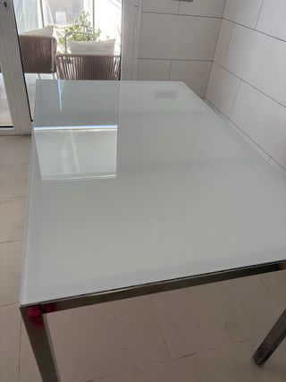 Mesa de cristal de diseño - Mesa de cristal de 1.80 metros de largo x 0.9m de ancho. - Diseño moderno y limpio. - Patas metálicas negras y gris. Perfecto estado, prácticamente nuevo todo sin apenas uso, de ahí su venta.