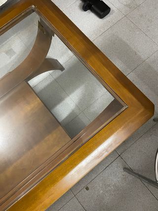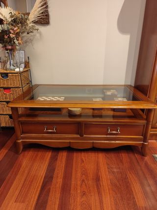 Elegante mesa de centro con superficie de cristal y estructura de madera. - Diseño moderno y funcional. - Amplio espacio de almacenamiento. - Acabado en tono madera cálido. - 120 cm largo, 70 cm ancho, 49 cm alto No hago envíos, solo recogida en persona. La mesa está en Amorebieta, Bizkaia.