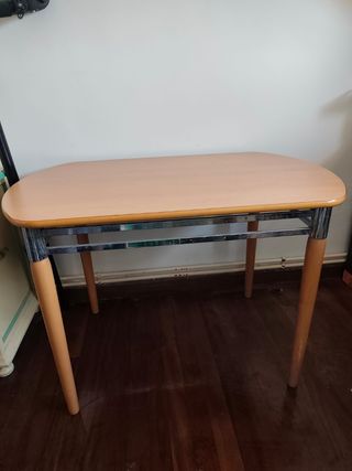 Mesa de comedor fabricada en madera maciza. Medidas cerrada: 120 cm (largo) × 90 cm (ancho) × 75 cm (alto). Dispone de dos extensiones laterales de 37,5 cm cada una, alcanzando un máximo de 195 cm de largo. Presenta marcas de uso visibles en las fotos, sin afectar a su estabilidad ni funcionamiento. Estructura sólida, patas y tablero firmes. Recogida en Donostia-San Sebastián.