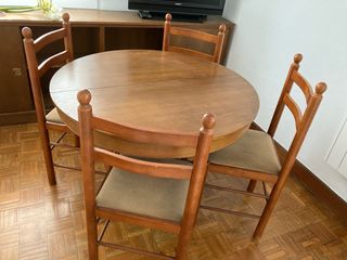 Mesa de comedor extensible en madera de cerezo, resistente y elegante. Incluye las sillas a juego. • Medidas cerrada: 120 x 120 cm • Medidas abierta: 120 x 160 cm • Estado: bueno Ideal para salón o comedor, práctica y fácil de adaptar según el número de comensales. Entrega en mano.