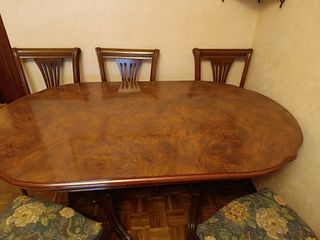 Preciosa mesa de comedor de madera maciza, extensible, ideal para darle un toque clásico y elegante a tu hogar. Se encuentra en buen estado. Extensible por ambos lados. Tambien dispongo de 4 sillas a juego, precio negociable si se lleva todo. - Estilo: Clásico - Acabado: Pulido