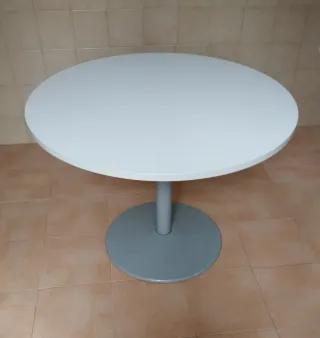 Mesa redonda con base central, ideal para cocina o comedor. - Tablero de color blanco melamina (en perfecto estado). Un metro de diámetro. - Base de color gris de metal (necesita pintar).