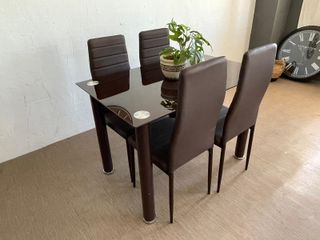 Elegante mesa de comedor con estructura de madera y superficie de cristal. - Diseño moderno y funcional. - Combina la calidez de la madera con la transparencia del cristal. INCLUYE 4 sillas como las de la foto, también en condiciones aceptables