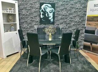 Conjunto de mesa de comedor con sobre de cristal y seis sillas. - Diseño moderno y elegante. - Patas de metal. - Tapicería de polipiel negra.