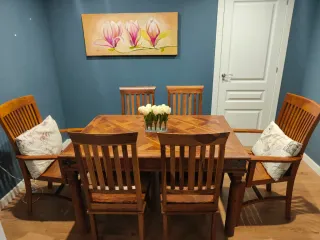 Conjunto de mesa de comedor redonda con seis sillas a juego. Ideal para crear un espacio acogedor en tu hogar. - Mesa de madera con acabado cálido. - Seis sillas con asientos tapizados en tela. - Diseño clásico y elegante. -Mesa extensible - Ancho 110 cm - Largo 130 cm - Largo extendido 170 cm