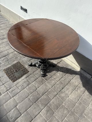 Mesa cuadrada de hostelería convertible en redonda con base de madera y pie de forja. - Diseño elegante y robusto. - Ideal para exteriores o interiores.