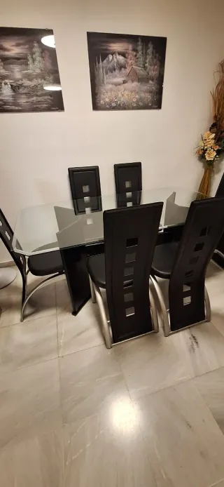 Conjunto de mesa de comedor con seis sillas. - Mesa de color negro. - Sillas con estructura de madera y asiento de tela. La mesa es extensible mide 2,40m x 1m aproximadamente.