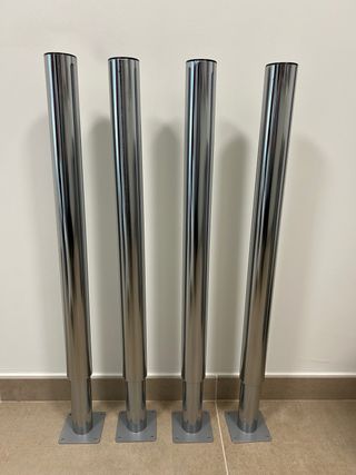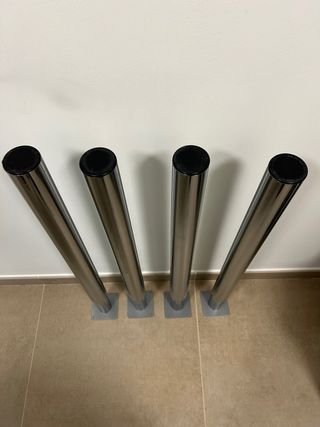 Set de cuatro patas de acero regulables en altura, ideales para mesas. De Leroy Merlin, con muy poco uso, como nuevas. Altura 70 - 110 cm. - Acabado plateado brillante. - Base cuadrada para mayor estabilidad.