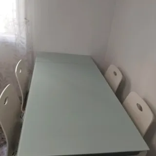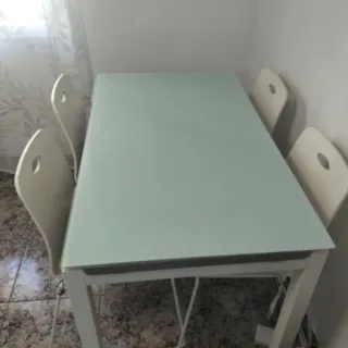 Conjunto de mesa con superficie de cristal y cuatro sillas a juego. - Diseño moderno y elegante. - Patas metálicas resistentes. - Tapicería de las sillas en material sintético. Medidas 110 x70 Ofrecemos envíos i montajes atendemos a WhatsApp 644169694